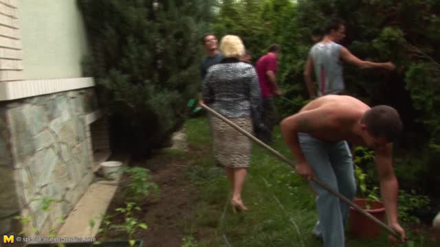 A horny, blonde, busty mom has sex with a young guy